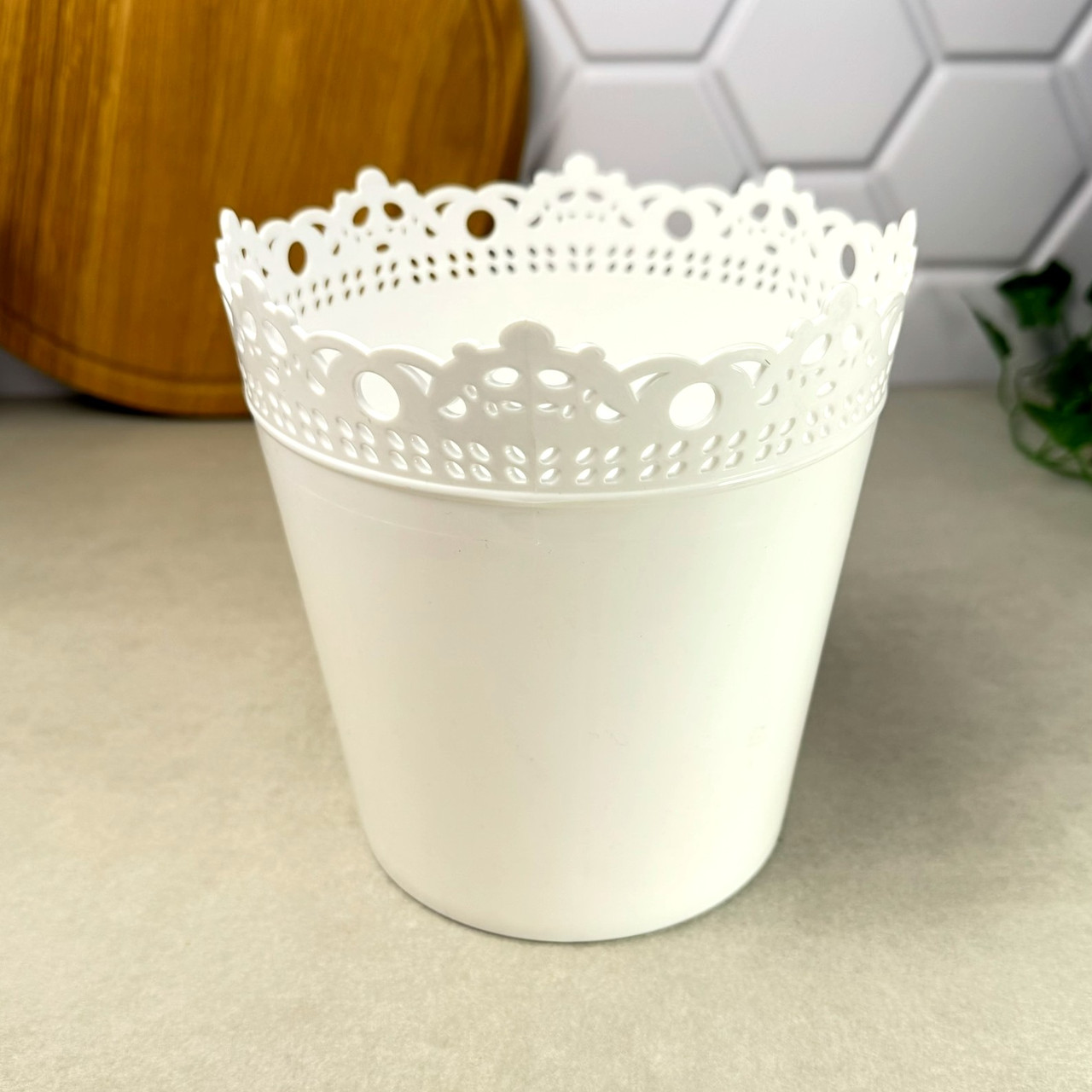 Пластиковий вазон "Рішельє" з ажурним краєм — витончене рішення для декорування квітів у приміщеннях та на відкритих майданчиках. Компактні розміри та елегантний дизайн роблять його універсальним для використання вдома, на балконі або в саду.